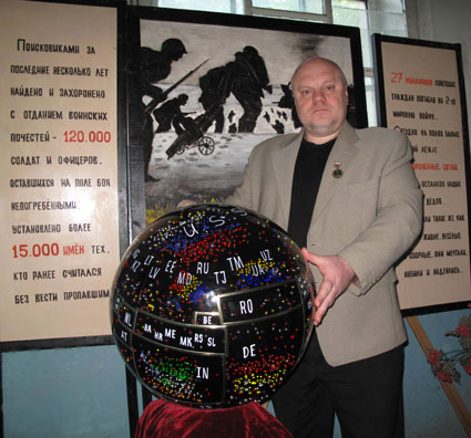-Да, таких проектов у меня много и они постоянно появляются новые. Я тут все перечислять и тем более описывать не буду, остановлюсь на самых для меня интересных Их три самых-самых. Первый из них – это, чтобы была выпущена наконец первая в мире мозаичная монета! Желательно «Мозаичный рубль». Я сейчас пытаюсь достучаться до Центрального банка, но вот пришло уже от них третье письмо и вновь они отвечают невпопад. Я им про возможность показать себя передовой страной на коллекционном мировом рынке монет, о событии в истории мировой культуры, а они мне все что-то твердят про многотысячные инвестиционные тиражи, инкрустация которых невозможна. С ГОЗНАКом и Монетным двором мы собирались все тысячи медалей инкрустировать – это было возможно, а десяток-сотню монет по мнению чиновников, которые даже не видели техники – невозможно… Я, конечно, стараюсь убедить и делать обходные маневры, но такая зашоренность в конце-концов может привести к тому, что такую супер оригинальную монету выпустит какая-то другая страна, правда, ей придется в любом случае заказывать чеканку на нашем ММД. Эскиз такой монеты с изображенным на ней флагом, мозаику в котором можно будет менять по желанию, я уже сделал. Другой проект я уже пытаюсь раскрутить с 2010 года – идея создания «Глобуса Памяти». Я уже начал делать небольшой ювелирный диаметром всего 50 сантиметров, но уже включил его в монументальный, увеличенный аналог в музейный проект «Эмалевая комната» для размещения на улице. Суть проекта проста – все погибшие во время Второй мировой войны – 70 миллионов впервые будут показаны так, что будет видно в сравнении, какие потери понесла каждая страна в этой самой кровопролитной войне, то есть границы стран будут не географическими, а в зависимости от этих потерь из расчета, что один мозаичный элемент будет обозначать 1.000 погибших и возможно такие элементы сможет разместить каждый желающий. Третий мой проект особенно важен сегодня, когда на границе нашей страны идет настоящая война. Речь идет о первом знаке особого отличия за служение России, Русскому миру, но не просто знаке, а впервые в современной истории нашей страны - знаке монументальном, то есть именно не индивидуального ношения, а для размещения его на стене. При этом я уже сделал пилотный образец такого знака - «Большой Георгиевский Крест»…